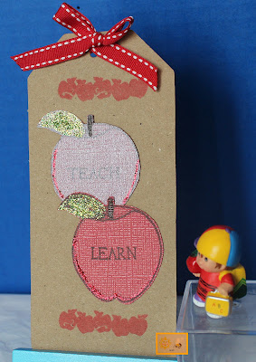 Created this Apples TEACH LEARN Back to School Tag/Bookmark using Kraft cardstock, Mark's Finest Papers Lesson Learned Apple and sentiments "TEACH" & "LEARN", studio g Apple border stamp, stickles & ribbon. Stamped the Apples on 2 different shades of red core'dinations cardstock. Cut the apples out. Stamped the Apples with sentiments "TEACH" & "LEARN." Used Tulip brown fabric paint for Apple stems. Added stickles to Apples. Stamped the Apple border. Added red stitched ribbon.