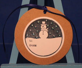 Created this Snowman Tag using a Stampin' Up Snowman from Tags til Christmas stamp set stamped with SU Midnight Muse ink on white cardstock. Cut with SU 1 3/4" circle punch. Used Kraft cardstock as base cut with SU 2 1/2" circle punch. Added dk blue ribbon. Added glitter to the snowflakes. The glitter does not show up well in the photo but looks nice in person.