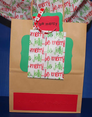 Created this Christmas Gift Bag altering a basic Kraft bag using green, red & white colors. Also used 'be merry be jolly' tissue not just in the bag but also on the front as a pocket. Embossed red cardstock with Cuttlebug Winter Border embossing border. Stamped sentiment 'be merry' on tag which is so appropriate since the tissue paper had 'be merry' words and inserted tag into pocket.