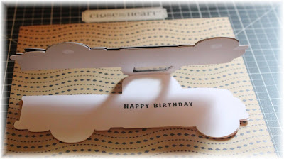 Made the Shaped Card using Cricut CTMH Stars and Sparklers Truck image. There are 4 layers to the truck: white, gray, black & blue. Cut the window out with an xacto knife & used some acetate plastic for window look. Stamped sentiment inside.